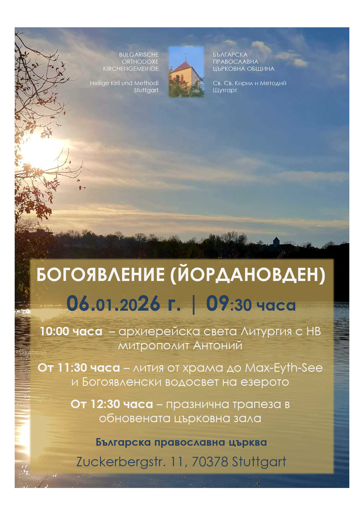 С удоволствие публикуваме информацията по-долу предоставена ни от българската православна църква в Щутгарт за предстоящата архиерейска света Литургия с НВ митрополит Антоний на Богоявление (Йордановден) и пожелаваме на всички весели празници!