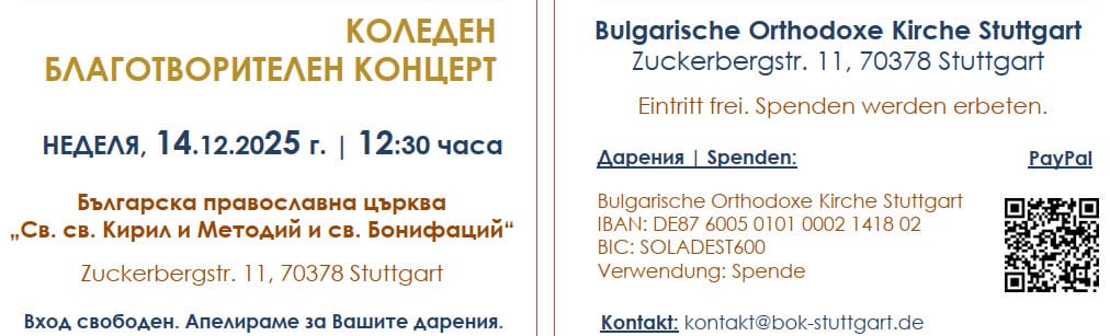 С удоволствие публикуваме информацията по-долу предоставена ни от българската православна църква в Щутгарт за предстоящия благотворителен концерт на 14.12.2025 и пожелаваме на всички весели празници!