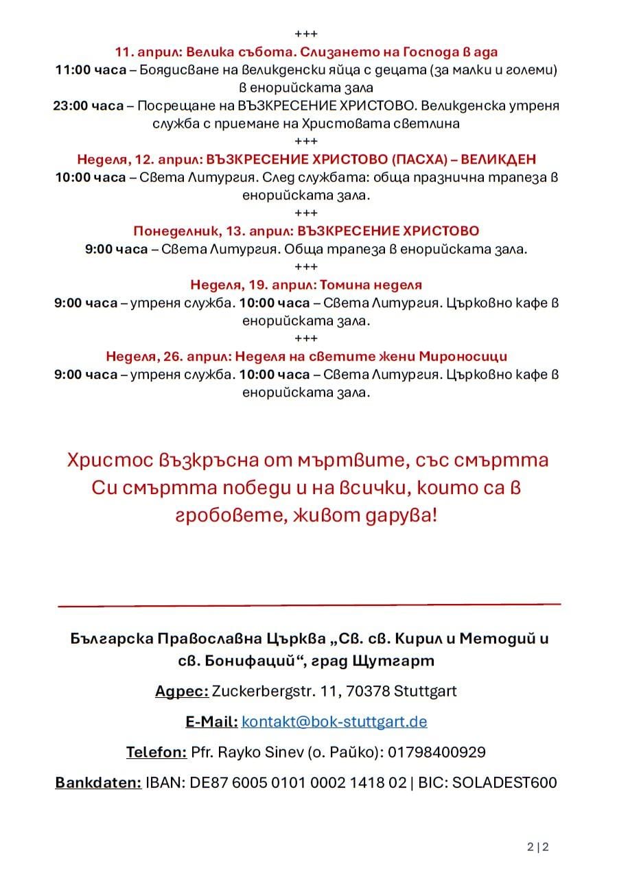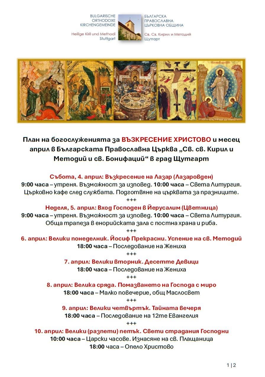 С удоволствие публикуваме информацията по-долу предоставена ни от българската православна църква в Щутгарт за планираните служби в храма за месец април и Великден и пожелаваме на всички весели празници!
